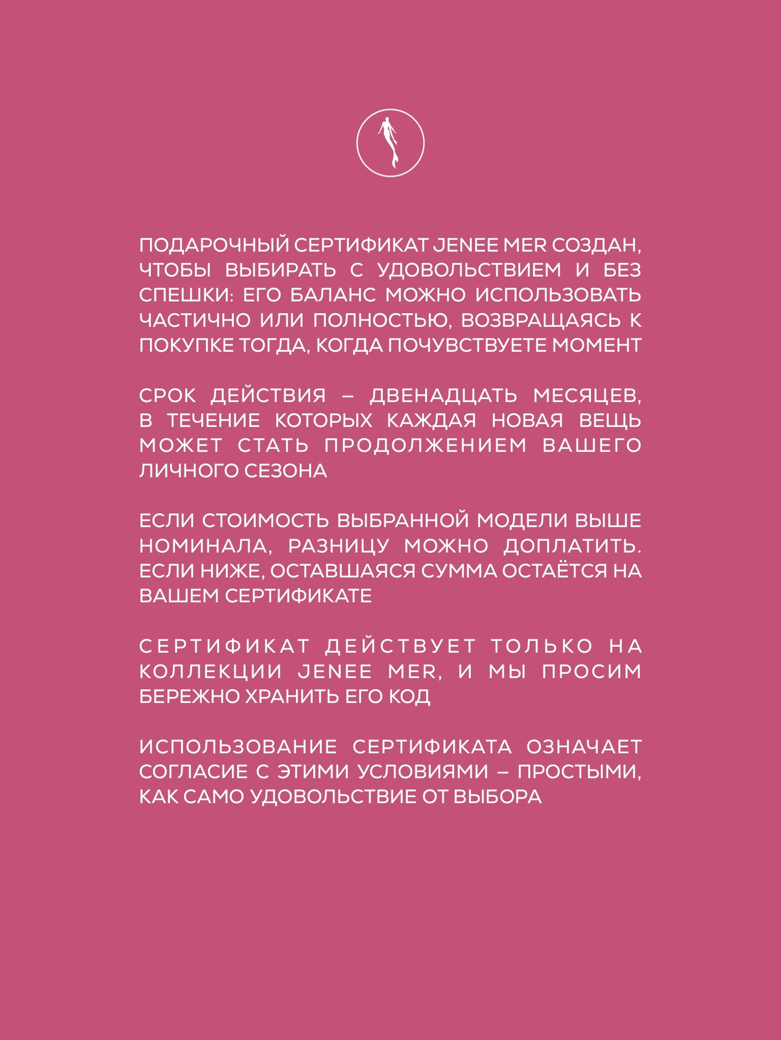 8. Сертификат действует только на товары бренда Jenee Mer, если иное не предусмотрено условиями акций.
